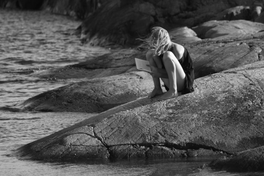 Min lillasyster Nora sitter och läser på en sten på ön Knarrholmen |