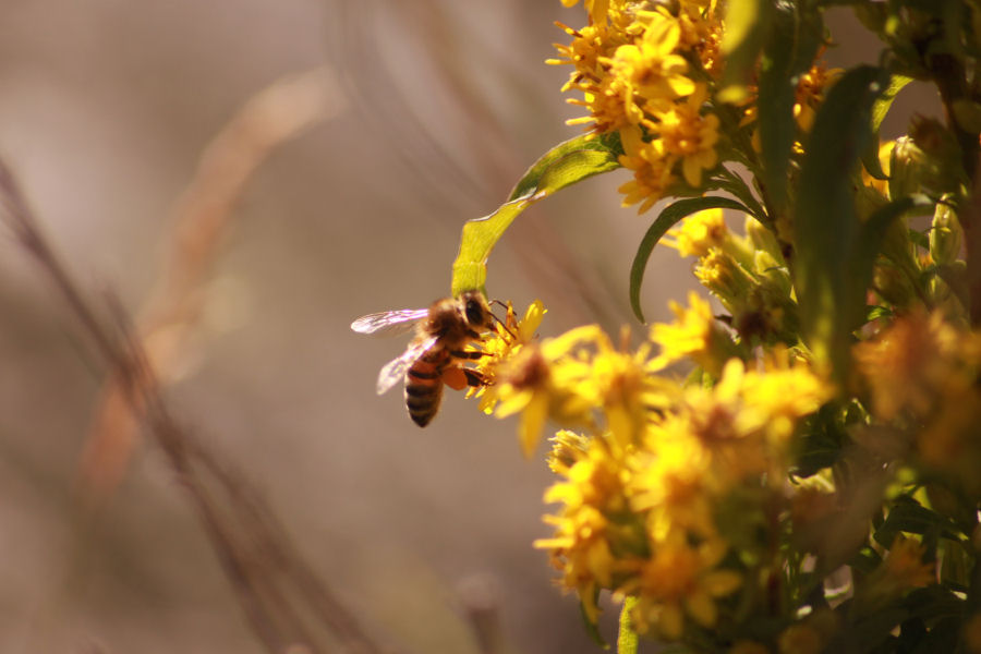 Ett bi sköter flitigt sitt arbete med att pollinera alla blommor på ön Knarrholmen i skärgården. |