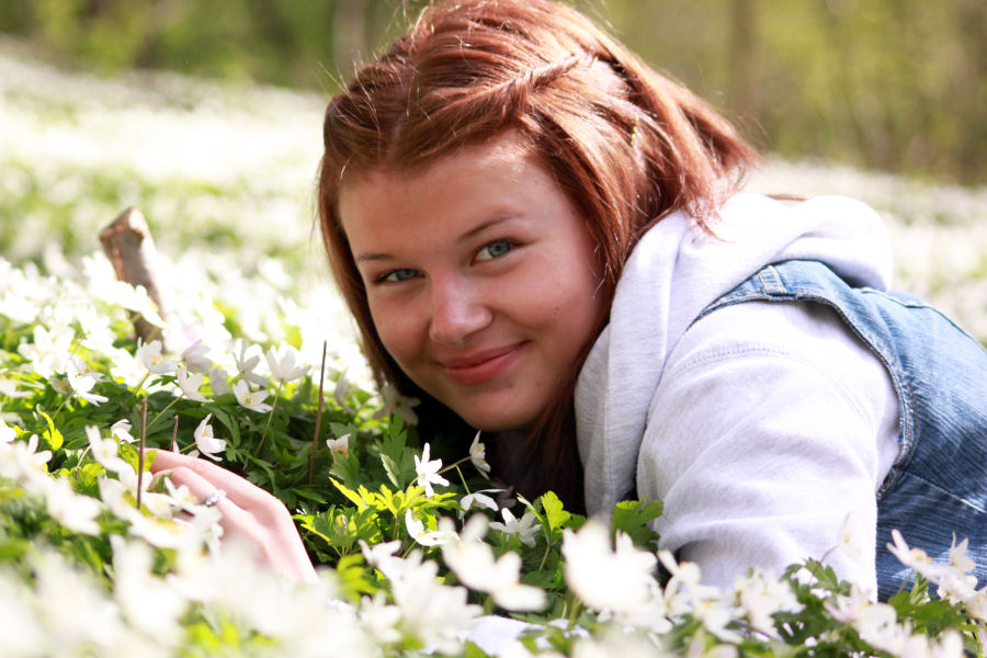 Ett porträtt på Sofia när hon ligger bland vitsipporna i Delsjön. |