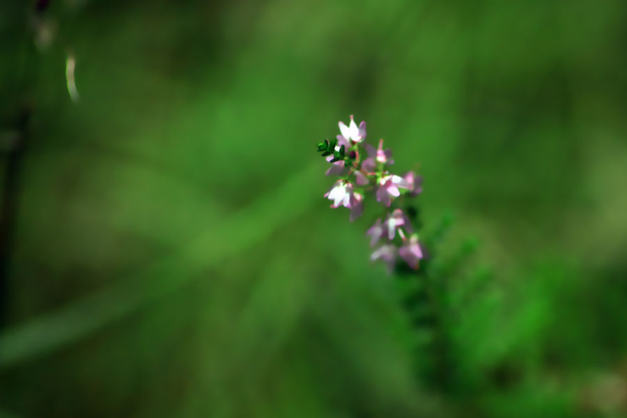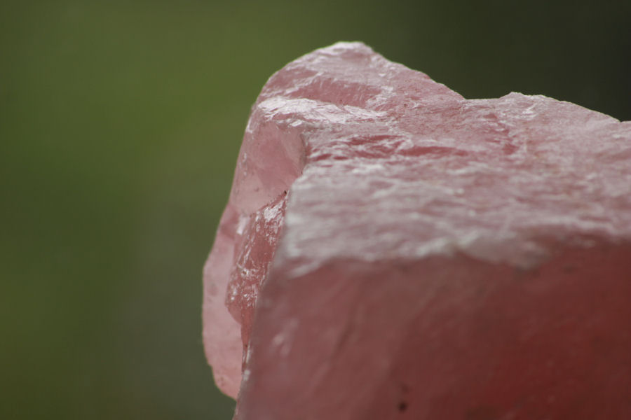 En fin rosa sten i mitt föster mot den sommriga gröna bakgrunden. |
