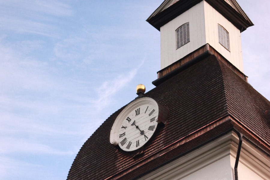En bild på kyrktornet i Kristdala en tidigt sommarmorgon. |