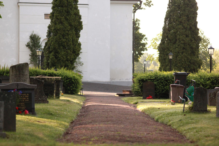 Solen lyserfridfullt in på de vackra gravarna framför kyrkan i Kristdala tidigt på morgonen. |